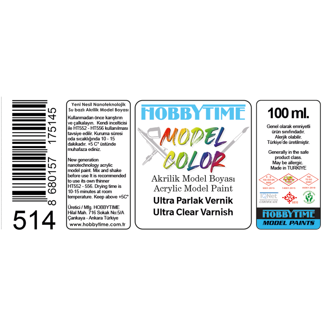 Hobbytime 514, 100 ml kapasiteli ultra parlak vernik, boyama projelerinize profesyonellik katmak için tasarlandı. Bu ürün, en iyi sonuçları elde etmek için gerekli olan yüksek kaliteli, berrak ve dayanıklı bir vernik sağlar.
