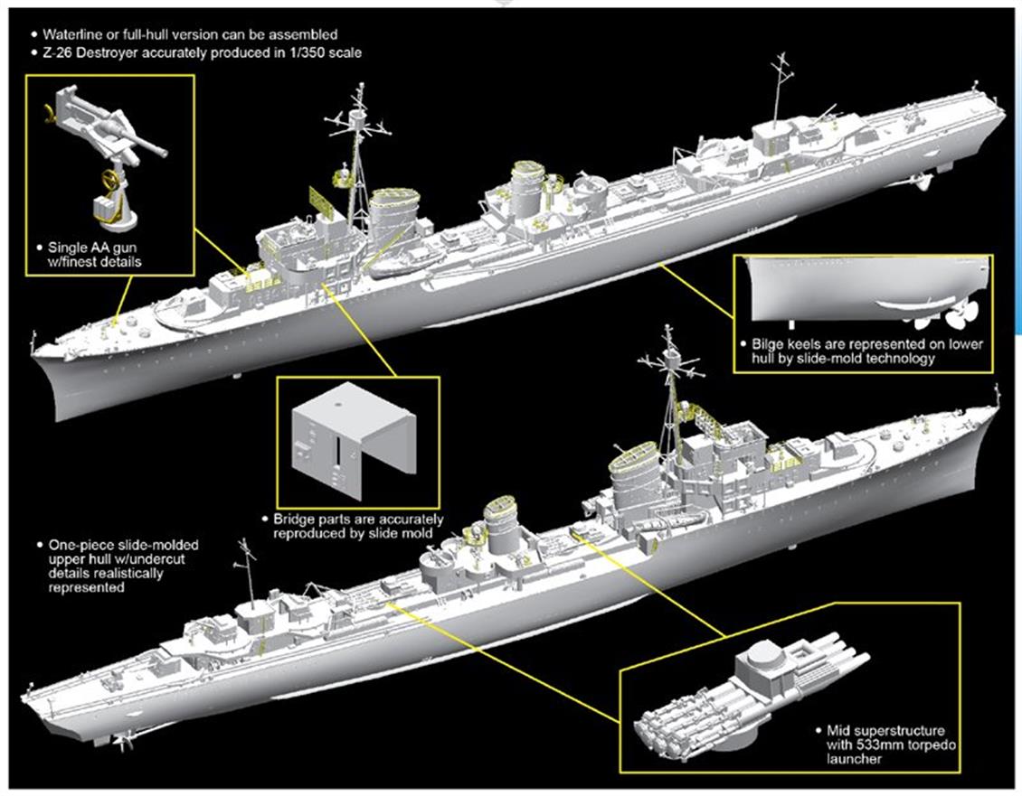 1/350 ölçek GERMAN Z 26 DESTROYER plastik maketi yapmak için ilk önce çerçeveden çıkart ve yapıştırıcı yardımıyla birleştir. Daha sonra yapım kılavuzu içerisinde yer alan renklere airbrush veya fırça yardımıyla boya.;