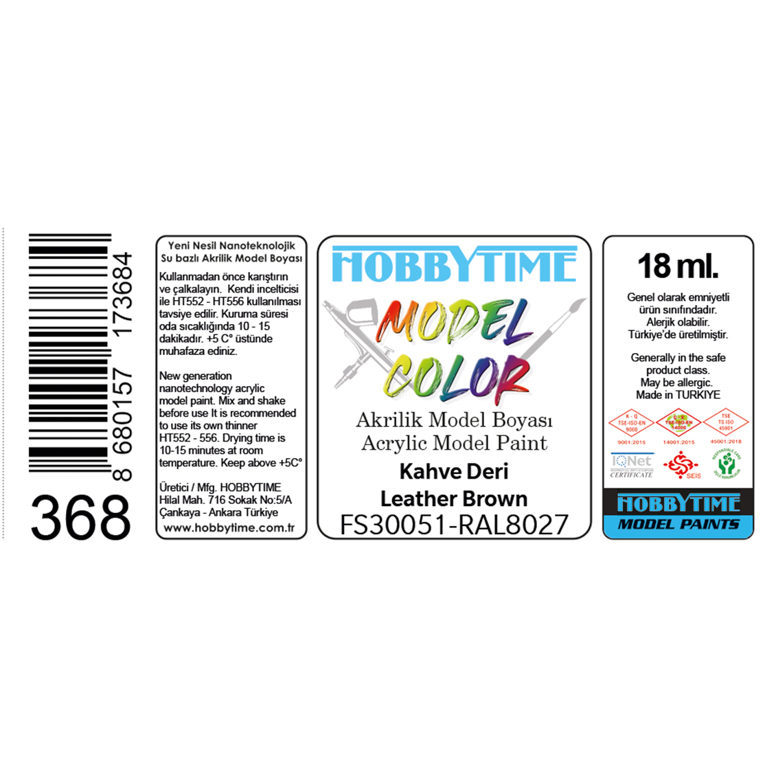 Maket, figür ve dioramaları renklendirmek için üretildi. Airbrush ve fırçayla kullanılabilen 18 ml. FS30051 RAL8027 Kahve Deri (Leather Brown)368 numaralı akrilik boya.