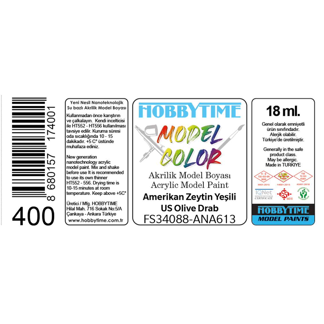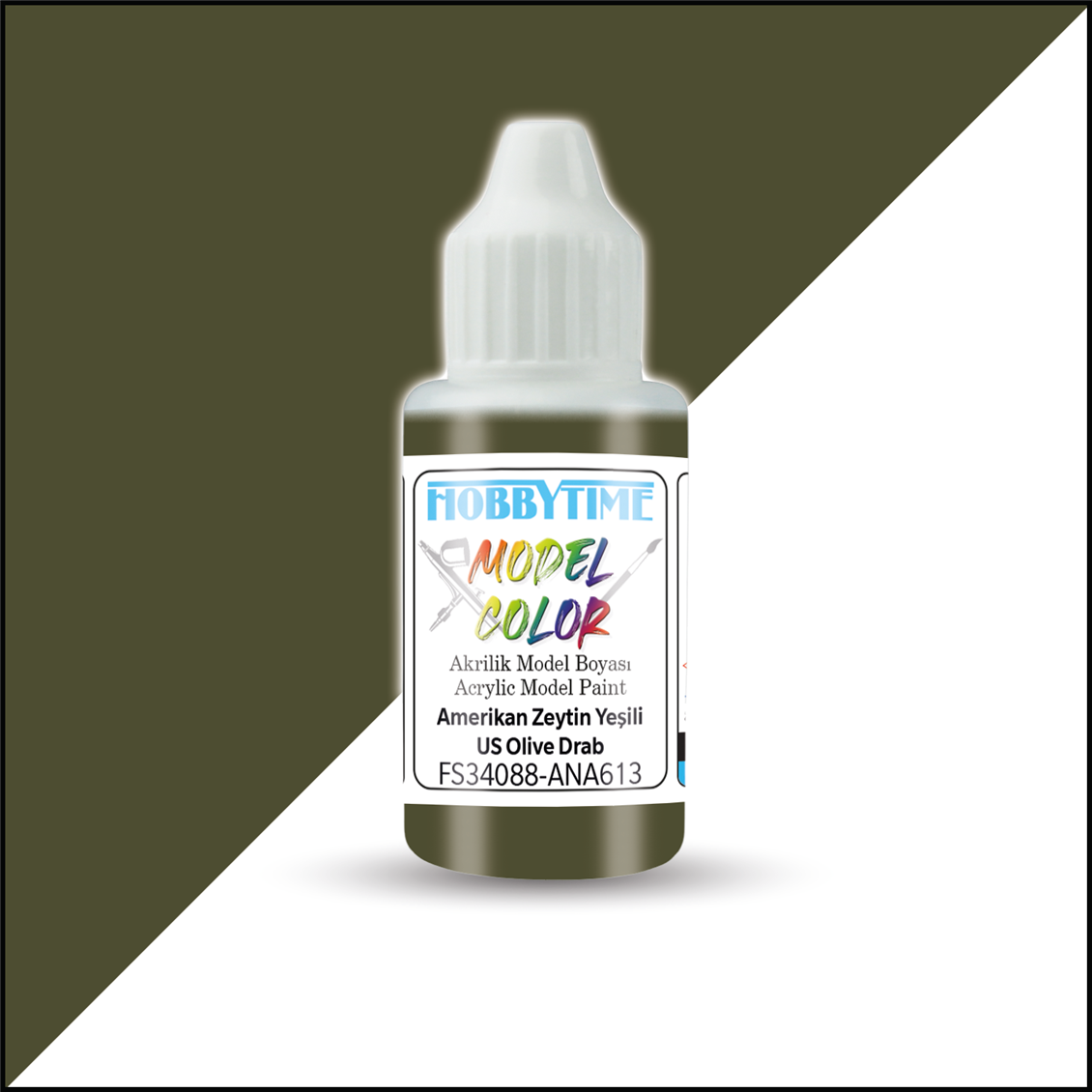 Maket, figür ve dioramaları renklendirmek için üretildi. Airbrush ve fırçayla kullanılabilen 18 ml. FS34088-ANA613 Amerikan Zeytin Yeşili (US Olive Drab) 400 numaralı akrilik boya.