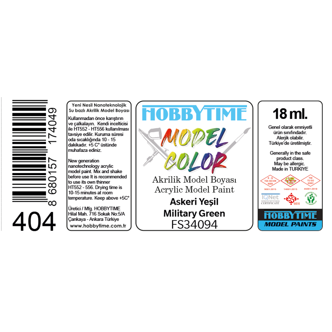 18 ml. FS34094 Askeri Yeşil (Military Green) Akrilik Boya, Hobbytime 404