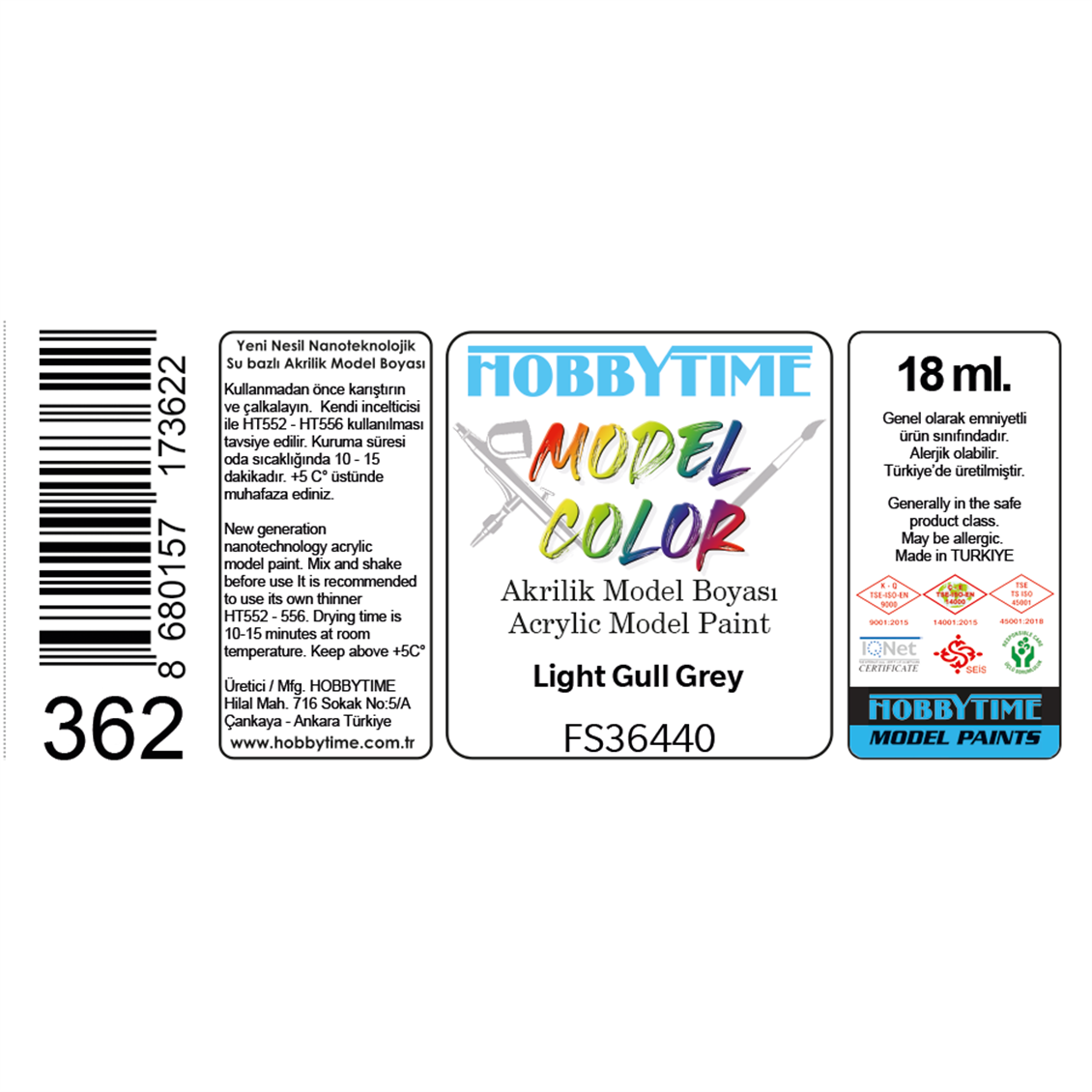 Maket, figür ve dioramaları renklendirmek için üretildi. Airbrush ve fırçayla kullanılabilen 18 ml. FS36440 Light Gull Grey 362 numaralı akrilik boya.