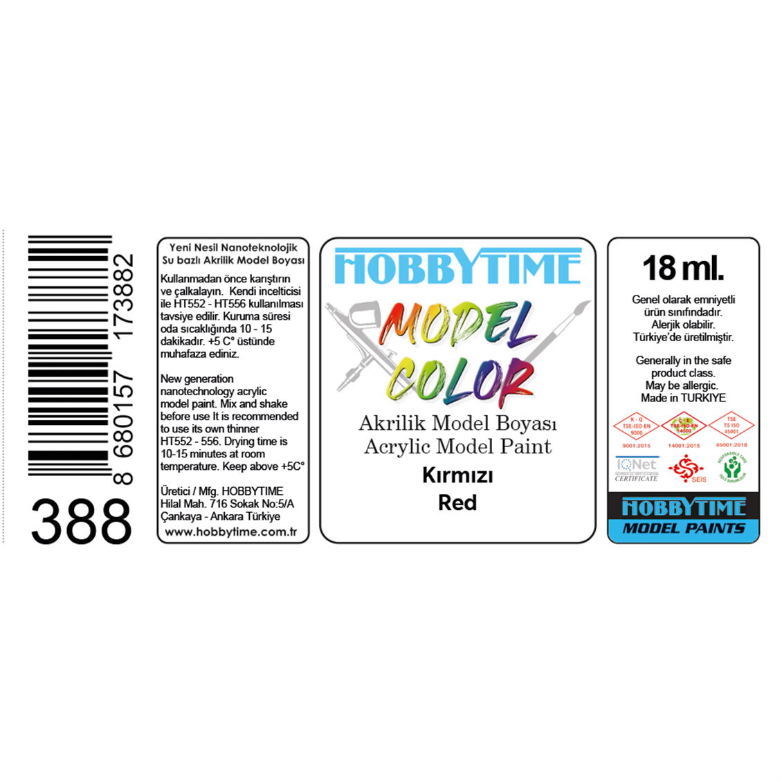 Maket, figür ve dioramaları renklendirmek için üretildi. Airbrush ve fırçayla kullanılabilen 18 ml. Kırmızı (Red) 388 numaralı akrilik boya.