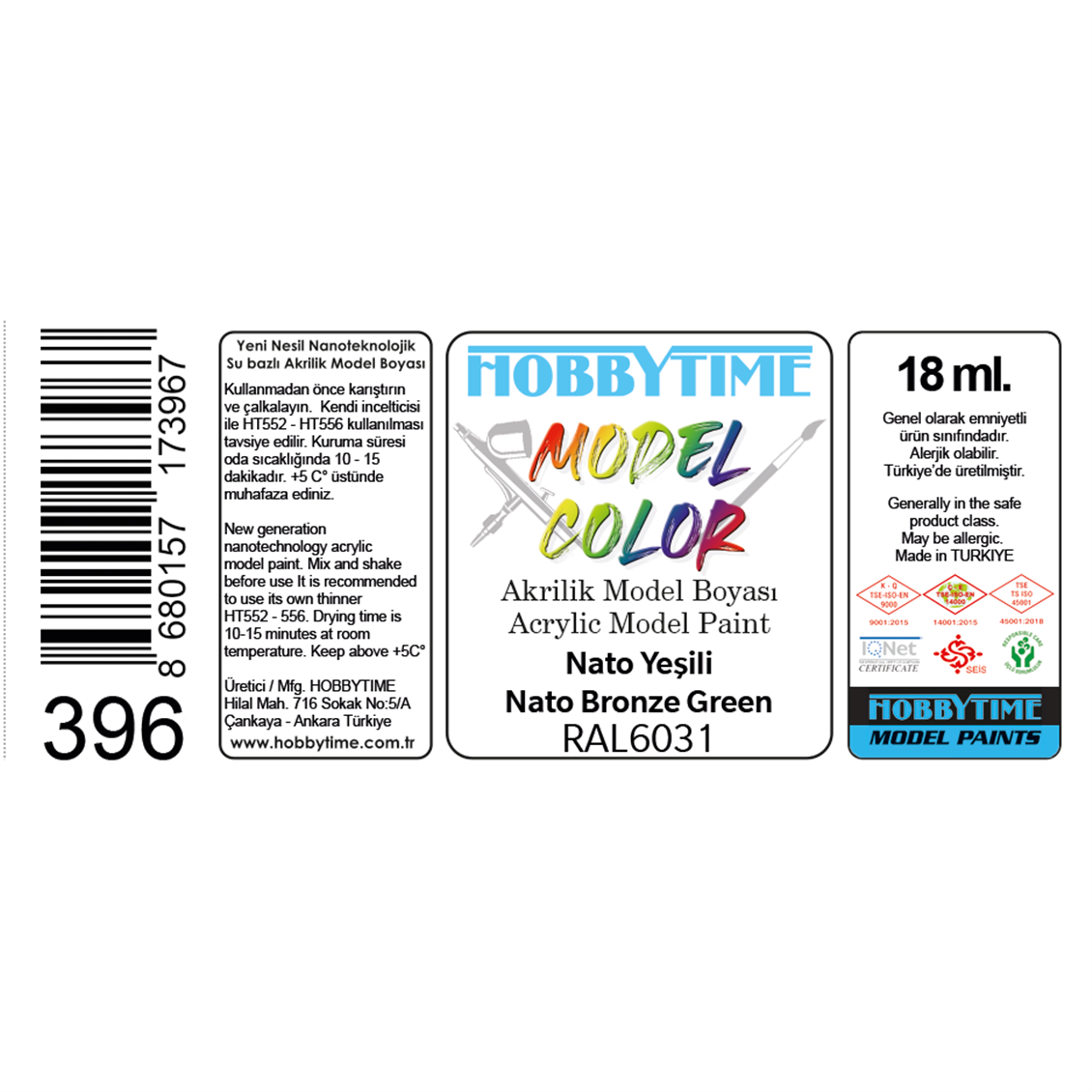 Maket, figür ve dioramaları renklendirmek için üretildi. Airbrush ve fırçayla kullanılabilen 18 ml. RAL6031 Nato Yeşili (Nato Bronze Green) 396 numaralı akrilik boya.