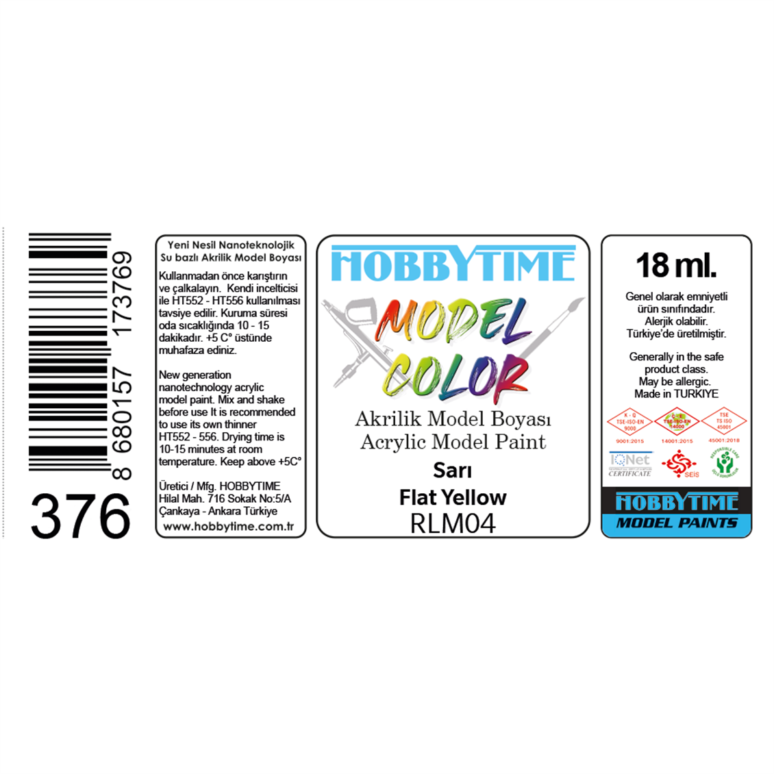 Maket, figür ve dioramaları renklendirmek için üretildi. Airbrush ve fırçayla kullanılabilen 18 ml. RLM04 Sarı (Flat Yellow) 376 numaralı akrilik boya.