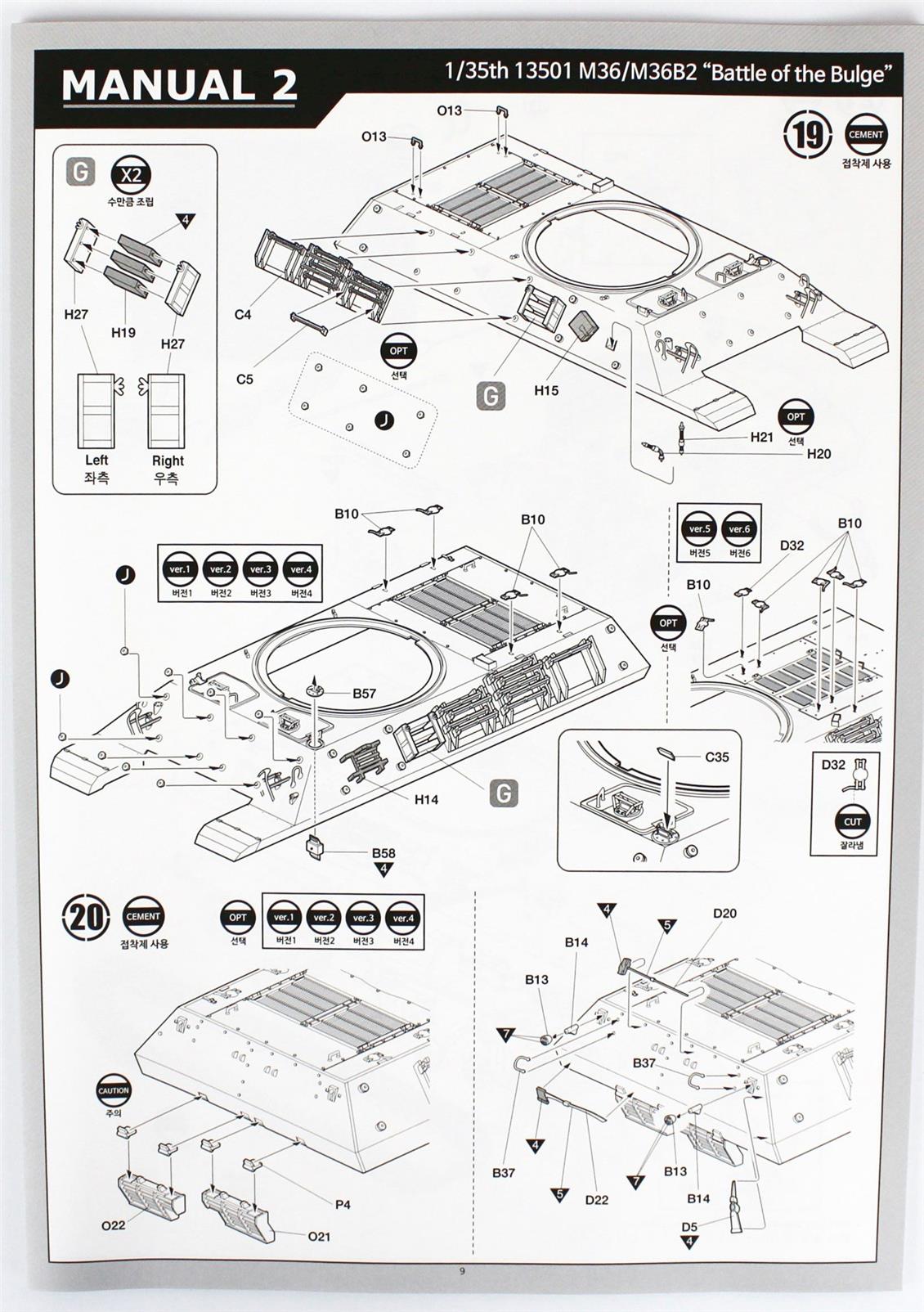 1/35 ölçek M36/M36B2 (Battle of the Bulge) Tankı plastik maketi yapmak için ilk önce çerçeveden çıkart ve yapıştırıcı yardımıyla birleştir. Daha sonra yapım kılavuzu içerisinde yer alan renklere airbrush veya fırça yardımıyla boya.;