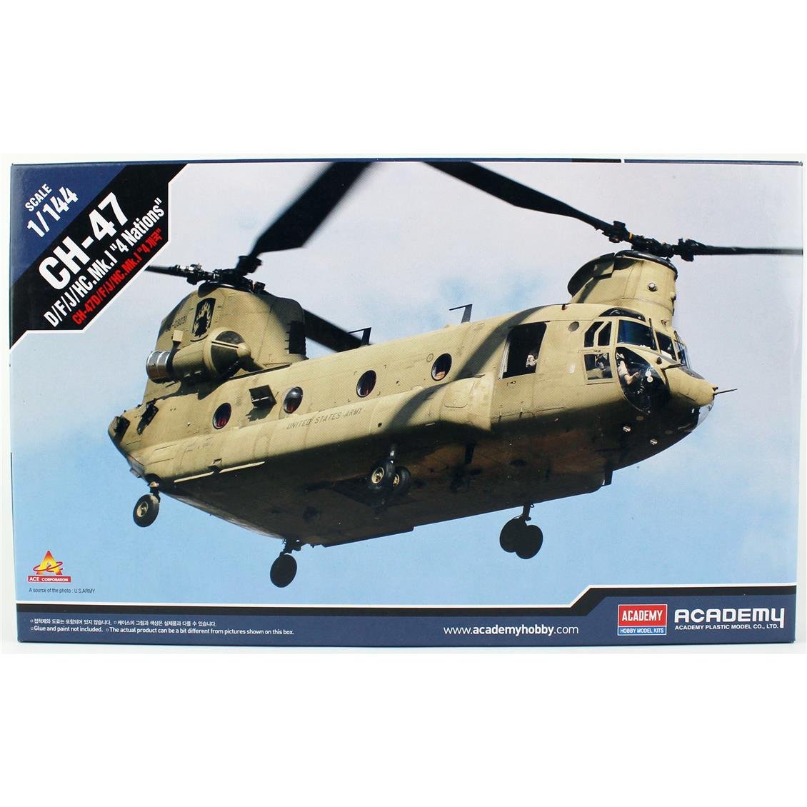 Academy 12624 1/144 CH-47D/F/J/HC.Mk.1 (4 nations) Askeri Helikopter plastik maketi yapmak için ilk önce çerçeveden çıkart ve yapıştırıcı yardımıyla birleştir. Daha sonra yapım kılavuzu içerisinde yer alan renklere airbrush veya fırça yardımıyla boya.;