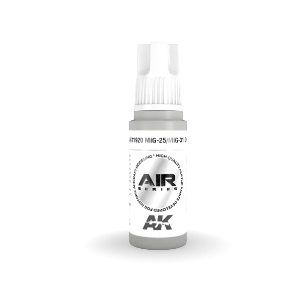 AK Interactive 11920, Rus pilotları tarafından kullanılan MİG-25 ve MİG-31 savaş uçaklarının gerçekçi bir görünümü için tasarlanmıştır. Bu Gri boya, farklı tarihlerde ve devletler arasında kullanılan farklı renk kodlarını (FS, RAL vb.) içeren özel tonları sunar.