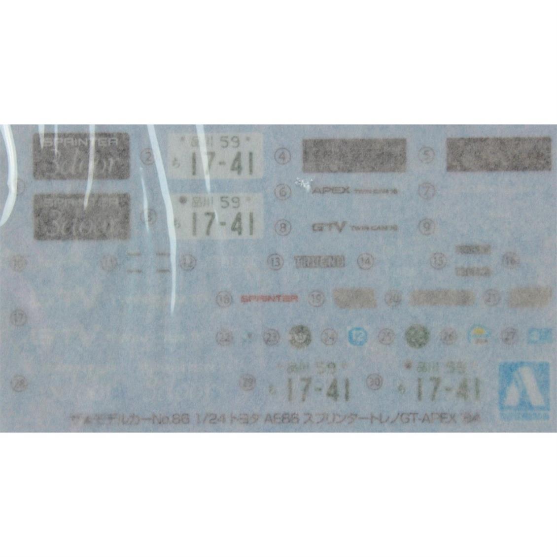 1/24 ölçek TOYOTA AE86 SPRINTER TRUENO GT-APEX ’84 plastik maketi yapmak için ilk önce çerçeveden çıkart ve yapıştırıcı yardımıyla birleştir. Daha sonra yapım kılavuzu içerisinde yer alan renklere airbrush veya fırça yardımıyla boya.;