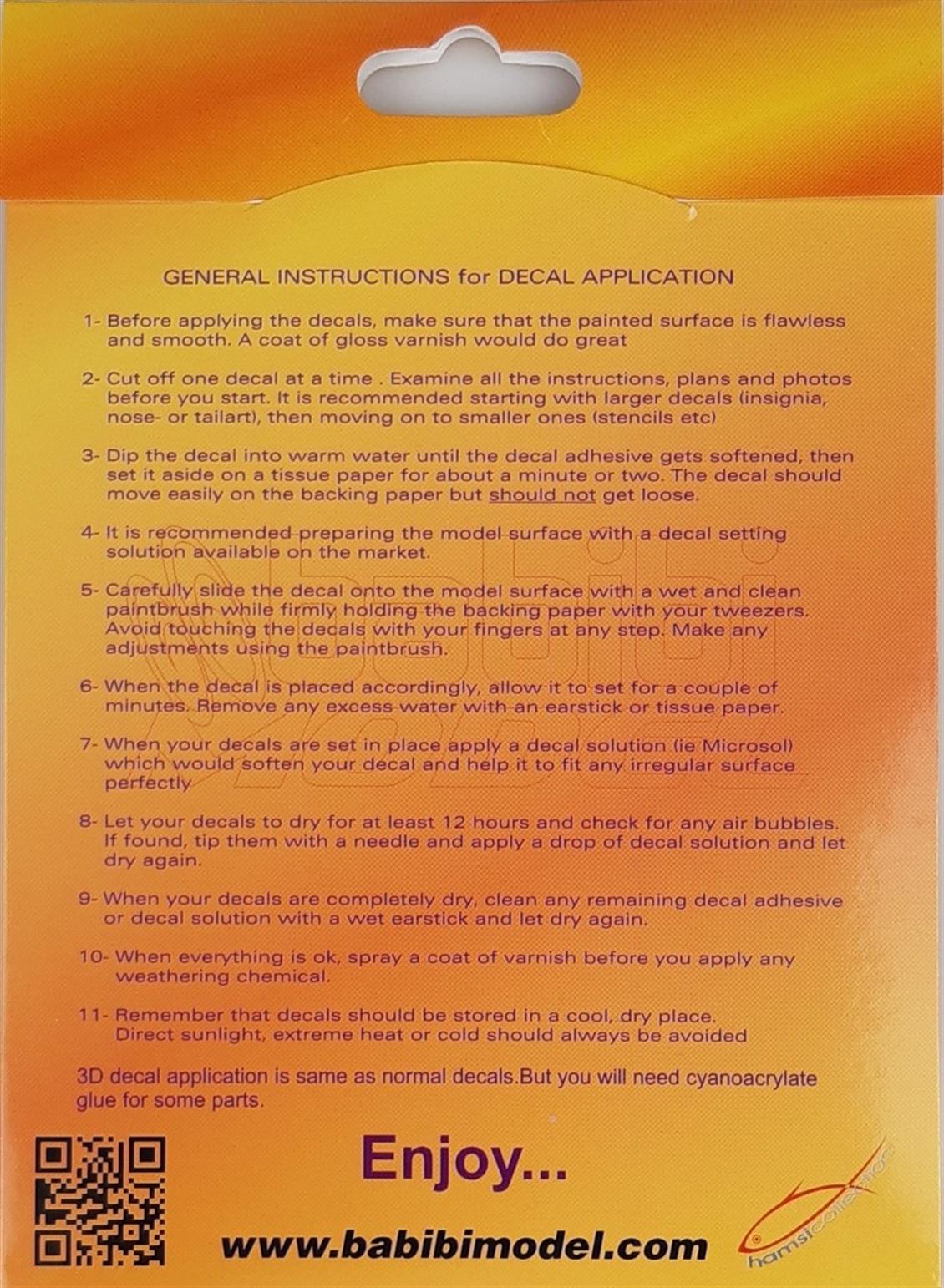 Babibi’nin sunduğu bu dekal, yüksek kaliteli baskı teknolojisi ile üretilmiş olup, uzun süreli kullanım için dayanıklıdır. Kolayca uygulanabilir ve modelinize ekstra detay katarak profesyonel bir görünüm sağlar. Özellikle havacılık ve askeri temalı modeller için mükemmel bir seçenek olan bu dekal, modellerinizi daha gerçekçi hale getirecektir.