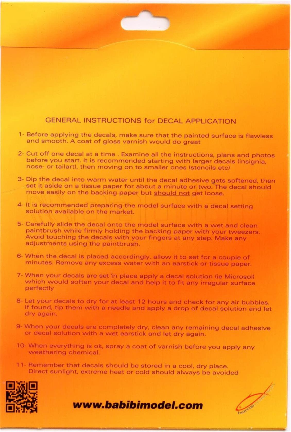 Babibi DBT-01193 dekal seti, 1/32 ölçekli F-16C model uçaklar için uygundur. Türk Hava Kuvvetleri’nin Tigermeet etkinliğinde kullanılan uçaklarının detaylarını ve özel tasarımlarını model uçaklarınıza uygulamak isteyen modelciler için ideal bir tercihtir. Gerçekçi ve kaliteli baskılar sayesinde model uçaklarınıza profesyonel bir görünüm kazandırır.