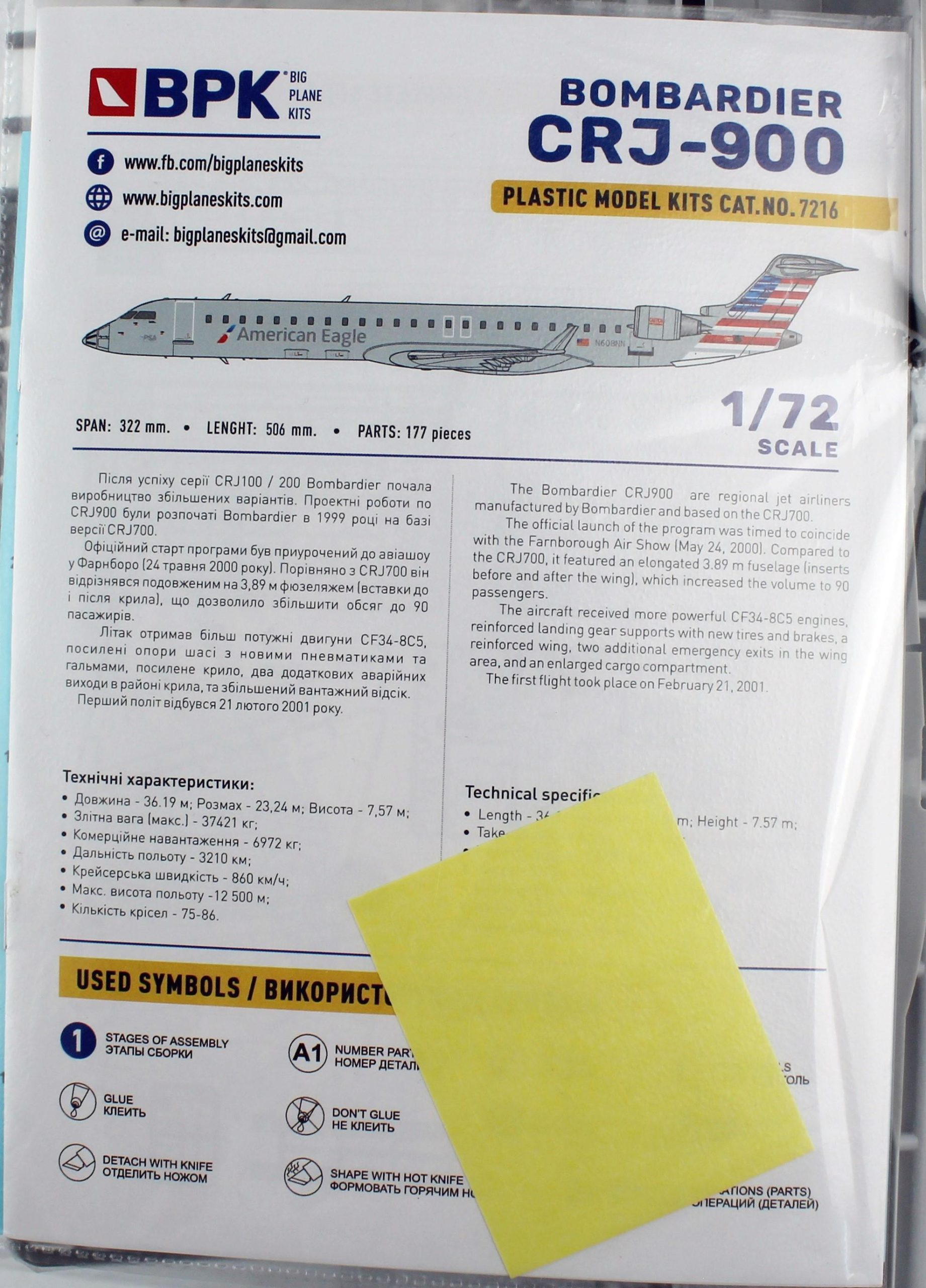 - Detaylı tasarım: Bombardier CRJ-900 modelinin American Eagle ve Air Canada renk şemalarını içeren 1/72 ölçekli plastik model kiti.