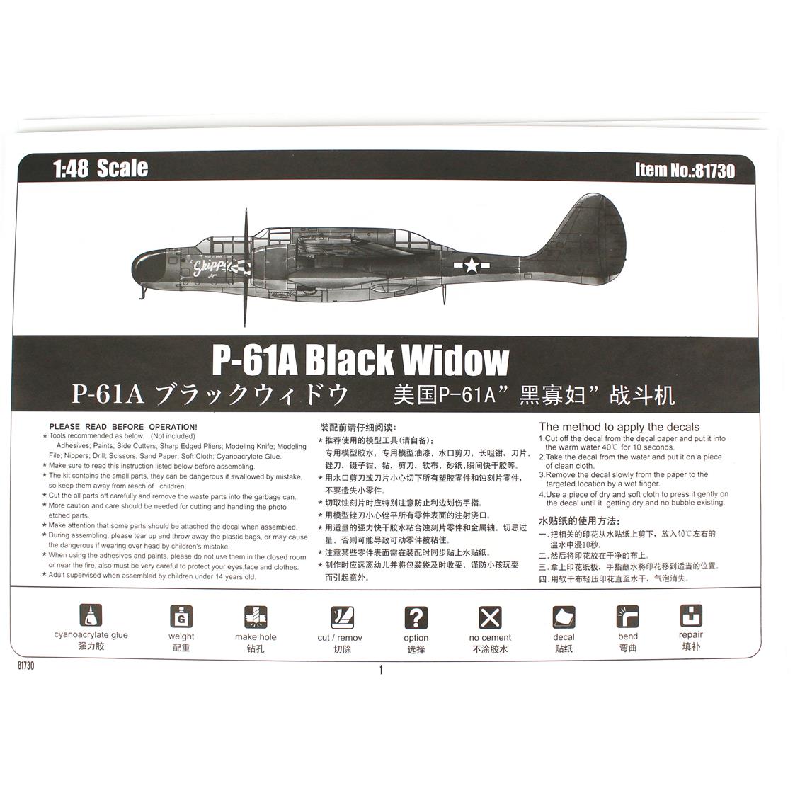 Kutu içerisinde 1/48 P-61A Black Widow Savaş Uçağı Maketi, montaj talimatları, kokpit detayları, motor bileşenleri, radar sistemi ve renk şeması yer alır. Boyama ve montaj talimatları ile özelleştirme imkanı sunulur.