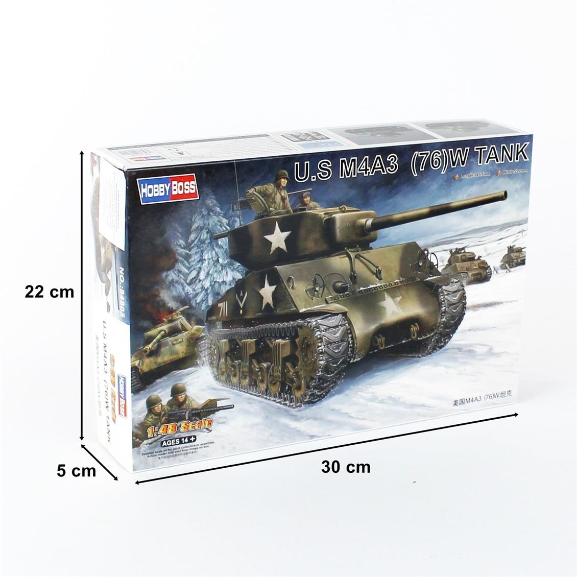 Kutu içerisinde 1/48 ölçekli M4A3 (76W) Sherman Tankı maketi, montaj talimatları, zırh detayları, hareketli parçalar, kamuflaj şemaları ve aksesuarlar yer almaktadır. Boyama ve montaj talimatları ile özelleştirme imkanı sunulur.