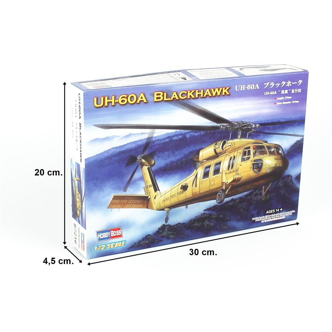 Kutu içerisinde 1/72 ölçekli UH-60A Blackhawk Askeri Helikopter maketi, montaj talimatları, rotor detayları, kokpit, iniş takımı ve aksesuarlar yer almaktadır. Boyama ve montaj talimatları ile özelleştirme imkanı sunulur.