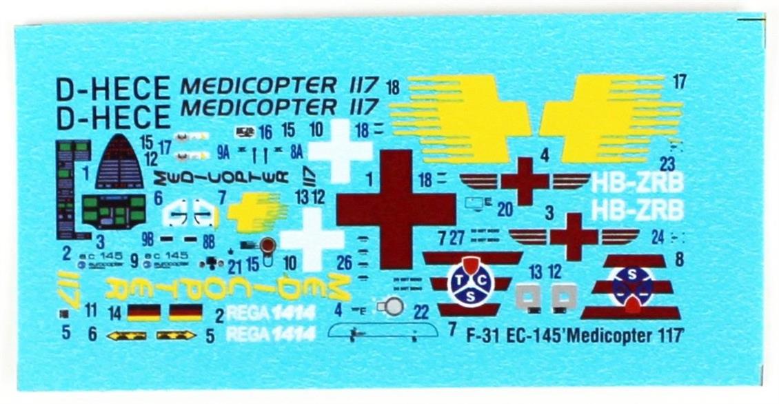 1/72 ölçek EC-145 Medicopter 117 (Rega) Çok Amaçlı helikopter plastik maketi yapmak için ilk önce çerçeveden çıkart ve yapıştırıcı yardımıyla birleştir. Daha sonra yapım kılavuzu içerisinde yer alan renklere airbrush veya fırça yardımıyla boya.;