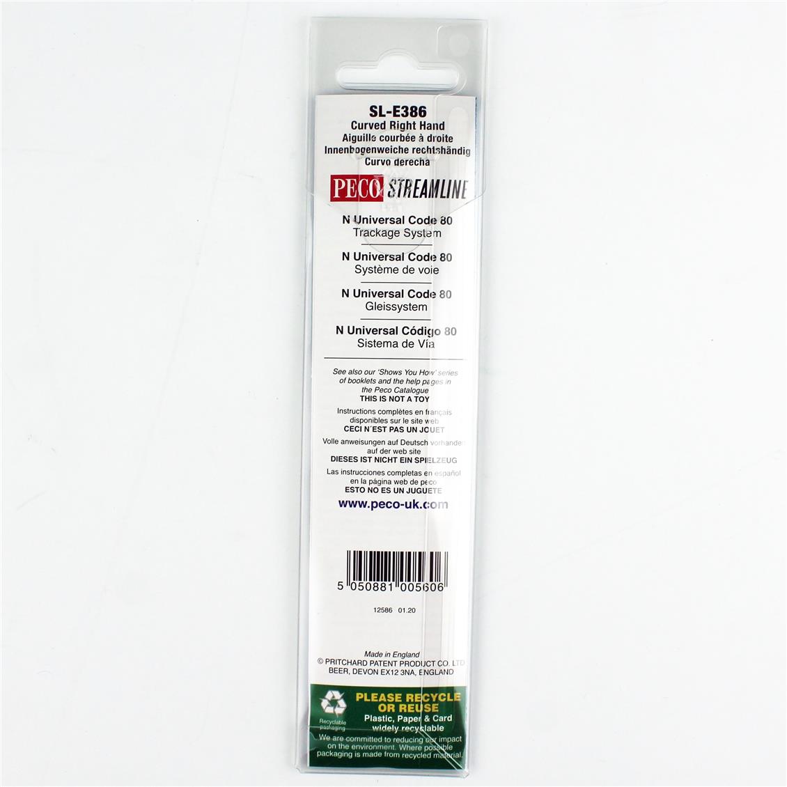 Peco SL-E386, Code 80 1/160 ölçekli model tren rayı, 457 ve 914 mm çap sağa dönüşlü ElektroFlog makas modeliyle öne çıkan bir ürün.