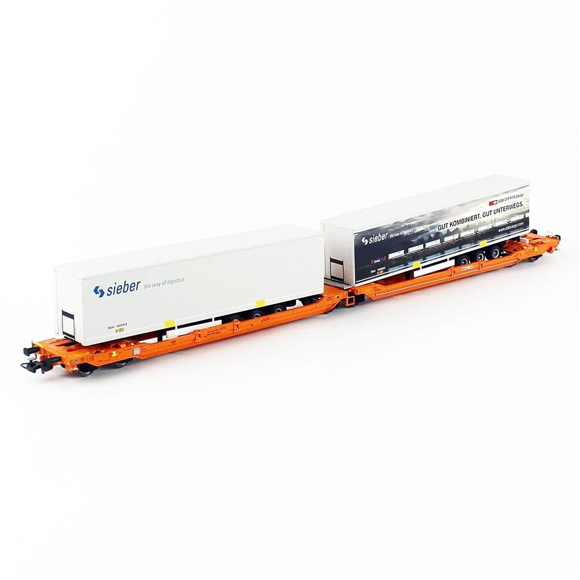 Detaylı Model Tren Yük Vagonu: 1/87 Articulated Intermodal Car T3000E Wascosa VI W 2 Sieber Trailers 2 Adet