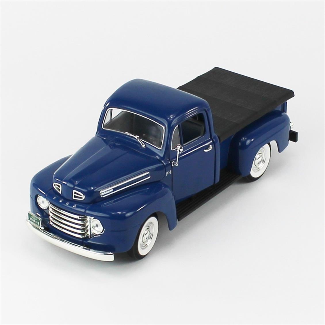 With its sleek blue finish and flatbed cover, this diecast model is a perfect representation of the iconic 1948 Ford F-1 Pickup.