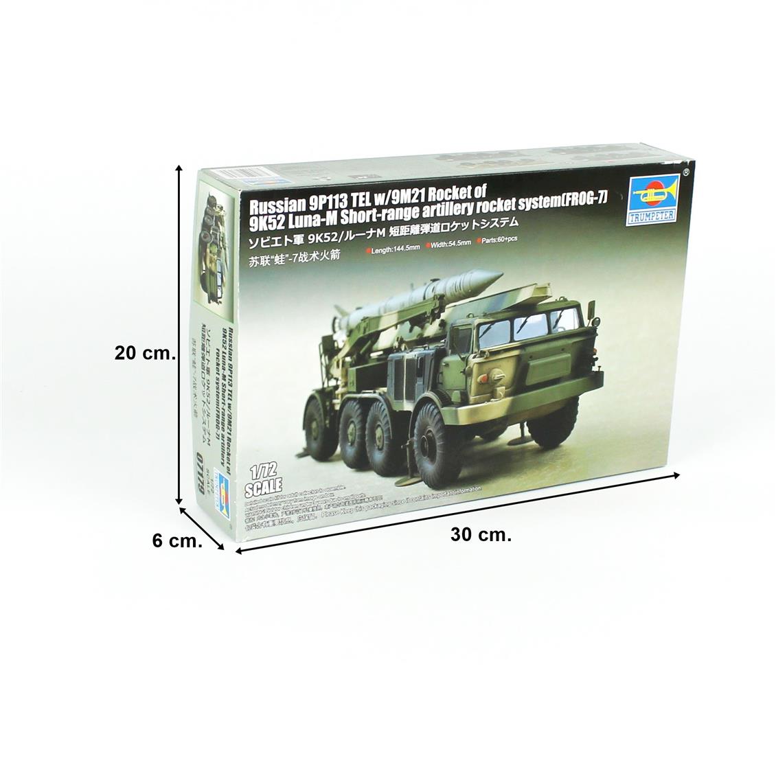 Kutu içerisinde 1/72 Rus 9P113 Kamyon ve 9M21 (9K52 Luna-M) Kısa Menzilli Füze Sistemi (FROG-7) Maketi, montaj talimatları, kamyon şasi, füze taşıma aparatı, radar anteni, füze konteyneri ve lastikler yer alır. Boyama ve özelleştirme için detaylı rehberlik sunan talimatlar da dahil edilmiştir.