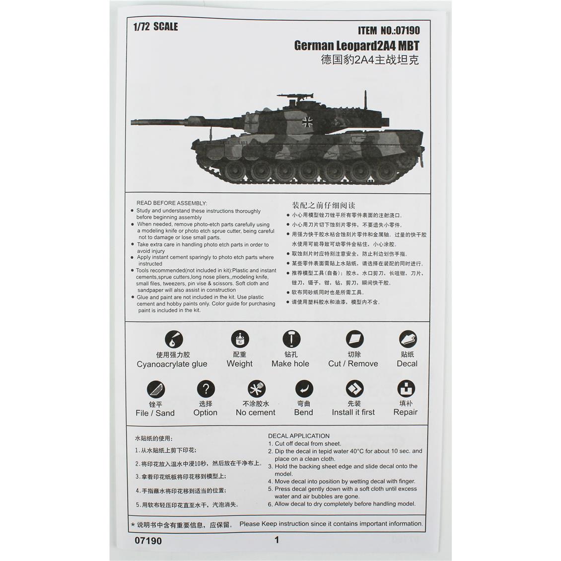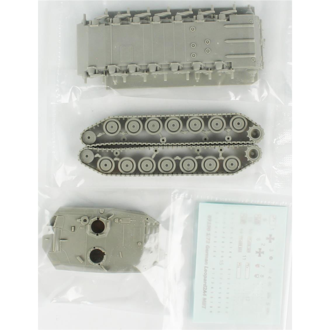 Kutu içerisinde 1/72 Alman Leopard 2A4 Ana Muharebe Tank Maketi, montaj talimatları, tank şasisi, zırh plakası, silah sistemi, hareketli paletler ve diğer detaylı parçalar yer alır. Boyama ve özelleştirme için detaylı rehberlik sunan talimatlar da dahil edilmiştir.