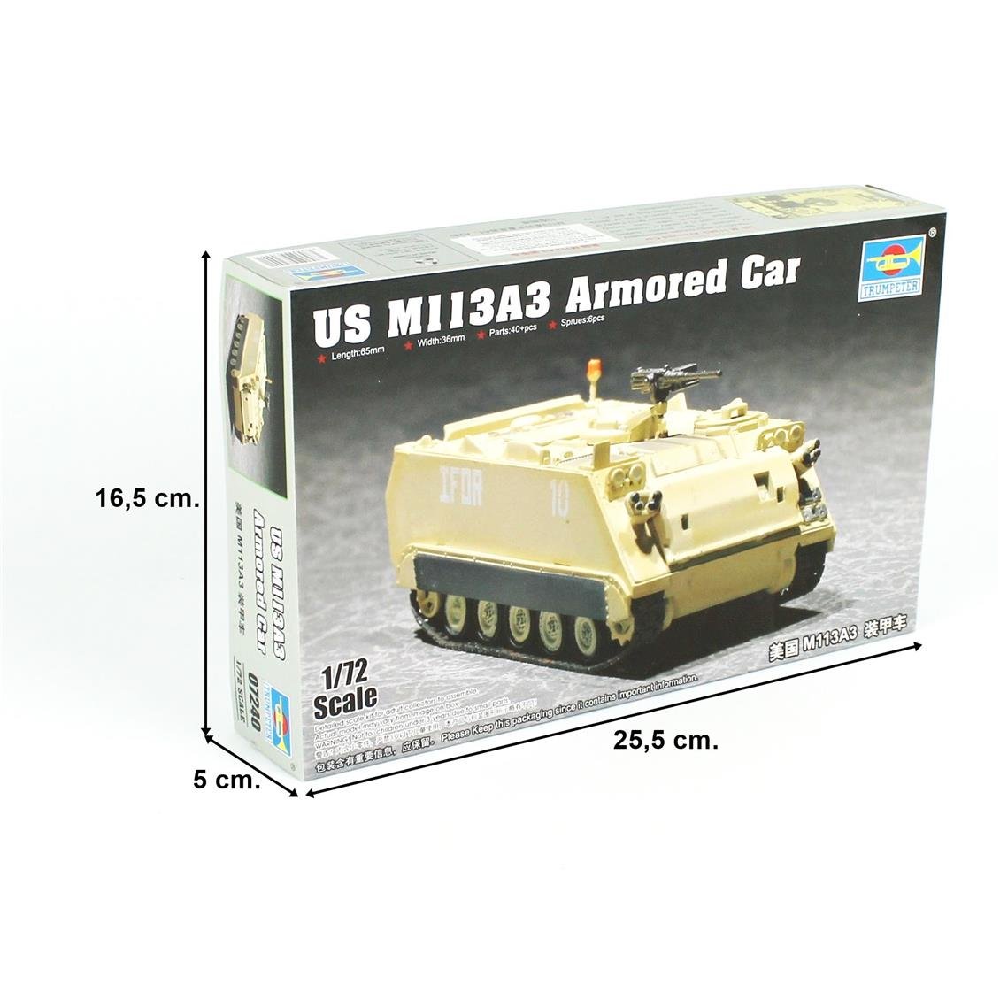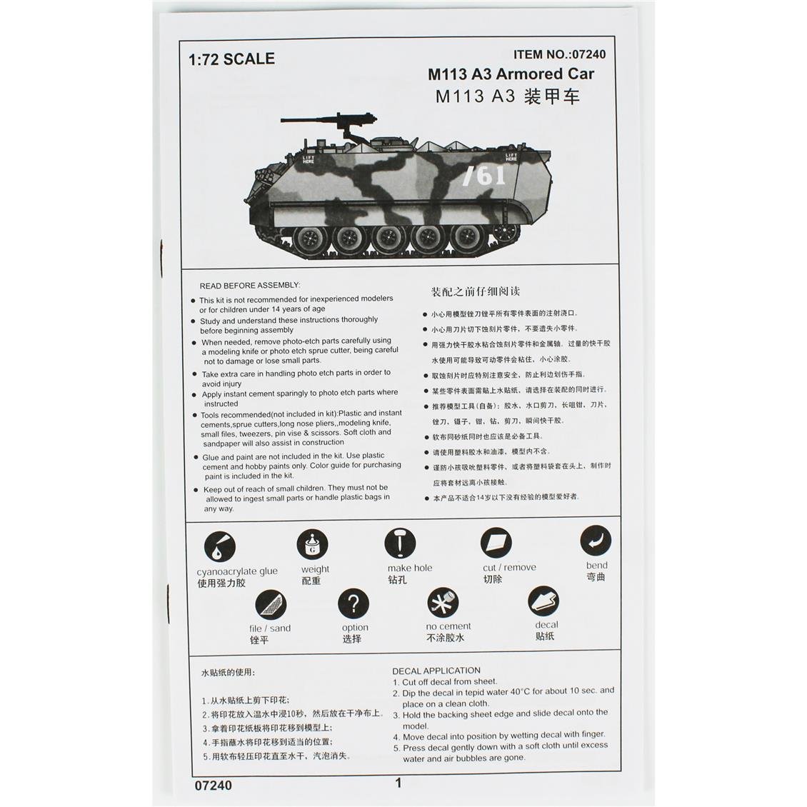 Kutu içerisinde 1/72 M113A3 Zırhlı Personel Taşıyıcı Maketi, montaj talimatları, zırhlı şasi, hareketli paletler, silah sistemi ve diğer detaylı parçalar yer alır. Boyama ve özelleştirme için rehberlik sunan detaylı talimatlar da dahil edilmiştir.
