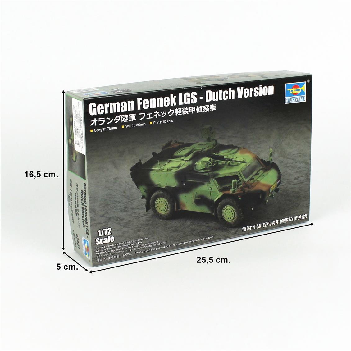 Kutu içerisinde 1/72 Alman Fennek LGS (Dutch Tipi) Hafif Zırhlı Araç Maketi, montaj talimatları, detaylı şasi, hareketli tekerlekler ve zırhlı donanımlar yer alır. Boyama ve özelleştirme için rehberlik sunan detaylı talimatlar da dahil edilmiştir.