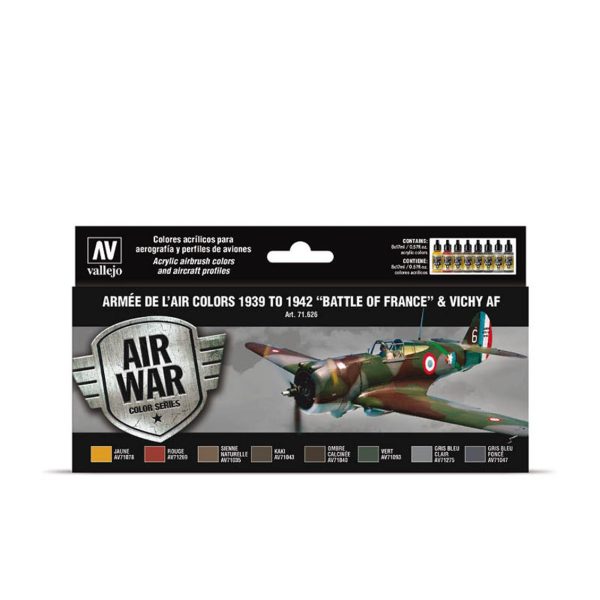 Vallejo 71626 model boya seti, 8×18 ml. kapasiteli boyalarla, 1939–1942 Fransa Muharebesi ve Vichy Hava Kuvvetleri Armée de l’Air tarihçesini yakalamak için kullanılan özel renkler serisidir. Bu set, modellere gerçekçi bir görünüm katabilen profesyonel model yapımcılar tarafından oluşturulan ve seçilmiş 16 boyalardan oluşur.